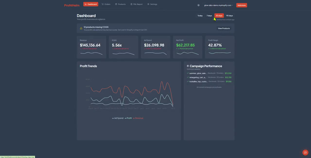 See accurate profit calculations updated daily. Revenue minus COGS, shipping fees, transaction costs, and ad spend from Facebook and Google (TikTok coming soon)—calculated automatically.